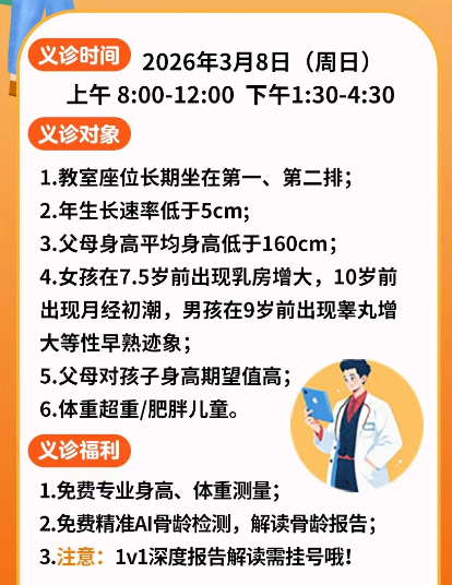 2026年3月8日,河北梅奥心血管病医院将举办“生长发育项目免费测骨龄活动”。为3-15周岁儿童提供专业骨龄检测,帮助家长科学掌握孩子的生长潜力,及时干预,助力孩子健康成长!